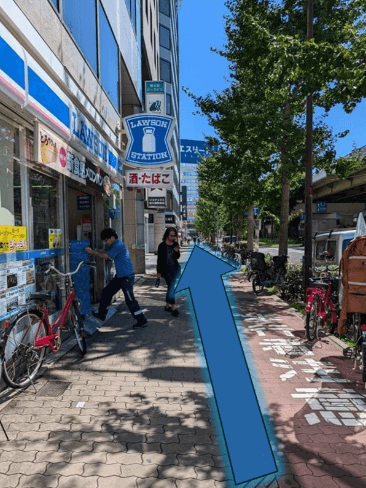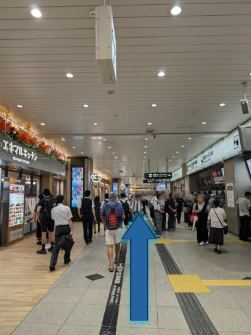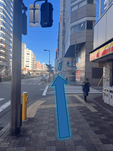 東改札口から出られましたら、右に曲がってまっすぐ進んでください。