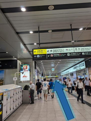 梅田方面行のホームから出られた方は、改札出て右に曲がってください。