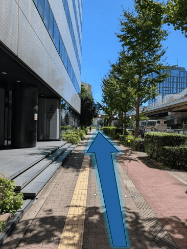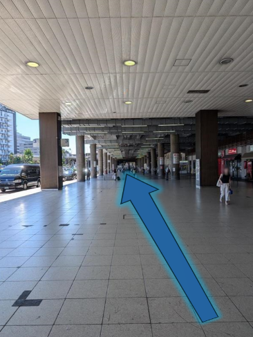 駅前の歩道を、北に向かってまっすぐ進んでください。